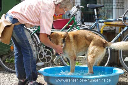 | Der liebe Ellie mit seiner Gassigängerin Martine beim erfrischenden Bad in einer Sandmuschel, die von den Hunden bei diesem Wetter sehr gerne genutzt wird ;-) |