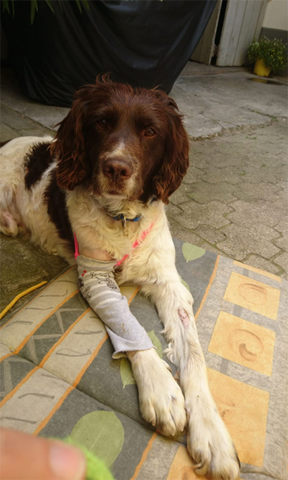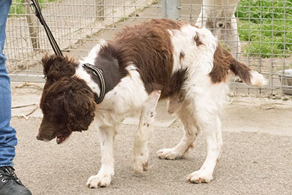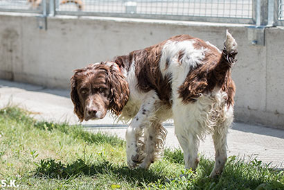 Er hat ein Problem mit seinem linken Vorderbein, wahrschienlich wurde er auch deswegen ausgesetzt.