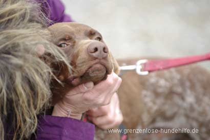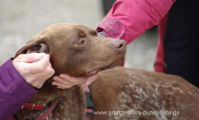 Heute bin ich dreimal zurück zu Eron, weil ich es einfach nicht über das Herz gebracht habe, ihn allein im Tierheim zurückzulassen. Er ist der am meisten verschmuste Hund, den ich je kennengelernt habe. Er braucht seine Streicheleinheiten wie die Luft zum atmen. Behutsam drückt er seinen Kopf in meinen Schoss, und würde am liebsten in mich hineinkriechen. Bei manch anderem Hund würde mir das vielleicht aufdringlich erscheinen, nicht aber bei Eron, denn er ist ein ganz sanfter Kerl, ein Herz von einem Hund. Noch dazu kommt, dass man mit dem Schatz schmusen kann, ohne danach voller Haare zu sein, oder zu riechen. Eron hat ein so tolles Fell, samtweich, so dass das innige Kuscheln noch schöner ist.