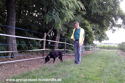 Der liebe Rüde läuft sehr entspannt an der Leine. Auch an anderen Hunden lässt er sich gut vorbei führen. Bei einem Bach geniesst er die Abkühlung und will da gar nicht mehr herauskommen. Nach einer weiteren Etappe auf unserem Spazierweg, lässt er sich ausgiebig streicheln und beschmusen.