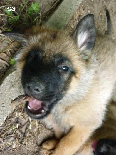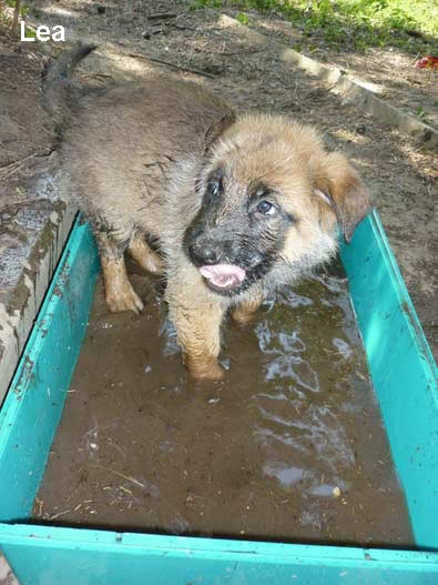 Lea: Lea hat von allen Welpen die umfassendste Wandlung vollzogen. Sie war stets die kleinste und leichteste und immer unser Sorgenkind. Bei den ersten Ausflügen ins Freie war sie noch sehr zurückhaltend und hat sich alles aus sicherer Entfernung angeschaut. Inzwischen ist sie gemeinsam mit Benito die Erste wenn es etwas Neues zu entdecken gibt. Sehr selbstständig, schläft sie schon einmallieber bei uns im Bett als bei ihren Geschwistern. Sie kann bereits ganz schön frech sein. Mama Eyscha hat manchmal ihre liebe Not damit sie zu disziplinieren.