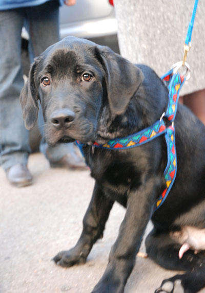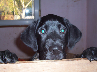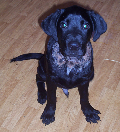 Prinz Felon, ein schwarzer Labrador-Rüde. Er ist ca. 4 Monate alt. Sein Hals sieht so aus, weil das das Halsband viel, viel zu eng war.....