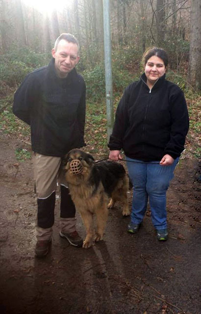 Wir haben den Maulkorb gewechselt, da er diesen besser tragen kann. Das funktionierte gut. Unterwegs gab es eine kleine Meinungsverschiedenheit, die ich jedoch zu meinen Gunsten wenden konnte. Für Filou ist alles hier völliges Neuland. Er hat immer gelernt, seinen Willen durchzusetzen, hier gilt es nun, seinen Willen in die richtige Bahn zu lenken. Lange Jahre war er auf sich gestellt. Jetzt muss er lernen sich fallen zu lassen. Wenn er das Rudel sieht, reagiert er völlig ruhig, das ist schon mal ein Anfang. Heute Nachmittag soll er die ersten Rudelmitglider kennen lernen. Jetzt ist der "Reset" - Knopf gedrückt, alles auf Null! Man sagte uns, dass er in den ersten zwei Jahren im Tierheim mindestens 11 Mal vermittelt war, und immer wieder kam er sehr schnell zurück, da er seine Zähne einsetzt, wenn er etwas erreichen will. Filou wird den Maulkorb sicher einige Zeit tragen und eine ganze Weile in seinem großen Zwinger wohnen. Dort ist sein Ruheplatz, sein Rückzugsort. Langsam, Schritt für Schritt werden wir aus ihm einen Rudelhund machen, der dann auch mit im Haus wohnen kann, aber das ist sicher ein langer, arbeits- und lehrreicher Weg.