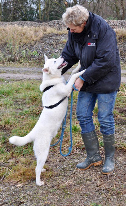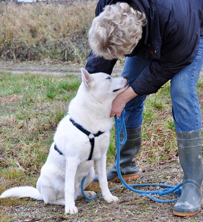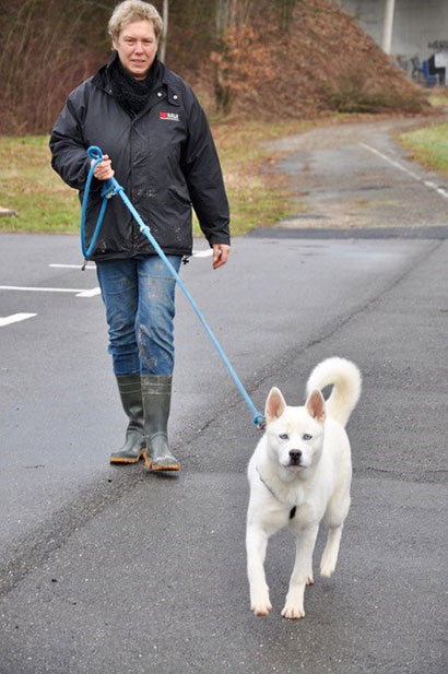 Flocon läuft anständig an der Schleppleine, nimmt die Leckerlies ganz vorsichtig und wedelt dabei freundlich mit dem Schwanz.