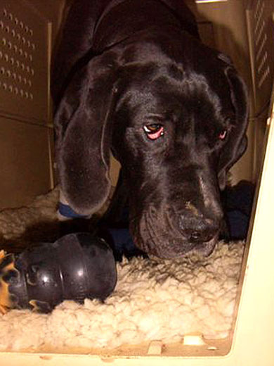 leicht angefrorenem Leckerkram gefüllten Kong zum