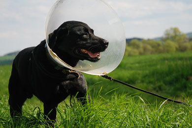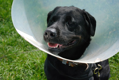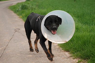 beim Tierarzt, er hat halt nen Maulkorb aufbekommen.
