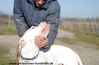 Ziemlich erschreckt hat uns sein Gangbild. Er läuft im Schritt fast normal und je schneller er wird desto mehr schwenken seine Hinterbeine und sein Becken hin und her. Als wir eine Weile mit dem großen Weißen unterwegs waren mußten wir bei näherem Betrachten in Erwägung ziehen, dass der Rüde dies schon lange hat. Wenn nicht sogar von Geburt an. Er läuft als wäre dies schon immer so und er scheint schmerzfrei zu sein.