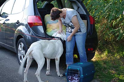 Im engen Zwinger wurden wir freundlich begrüßt und voller Freude ging dieser wunderschöne Rüde mit uns mit. Freundlich ist er zu allen Menschen und Hündinnen findet er toll.