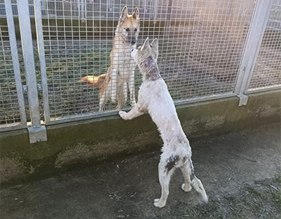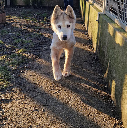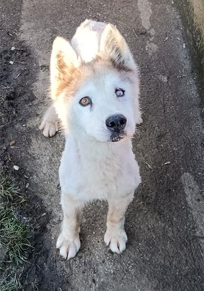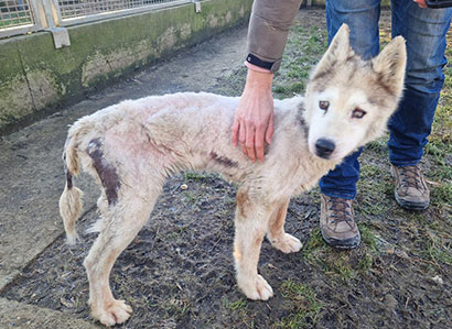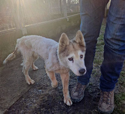 Als die kleinere, 14jährige Husky Hündin aus schlechter Haltung beschlagnahmt wurde, war ihr Fell in einem derart schrecklichen Zustand, dass sie komplett geschoren werden musste.