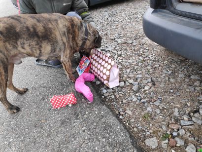 Es war für die Hunde ein wunderbar aufregender Morgen und es war später schön mit anzusehen, wie sie ihre Knabbereinen mit strahlenden Augen kauten, Ihr Spielzeug wie Trophäen umherschleppten.