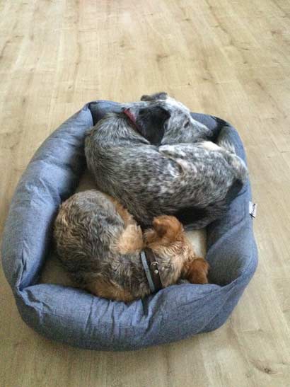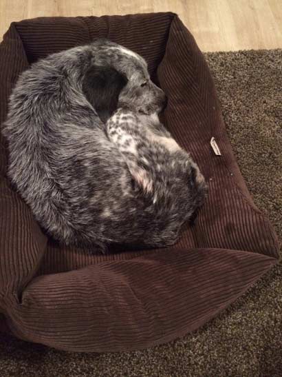 Alleinbleiben ist nun auch gar kein Problem mehr. Sowohl zuhause als auch bei Freunden bleibt er gut alleine und entspannt sich auf seinem Plätzchen.