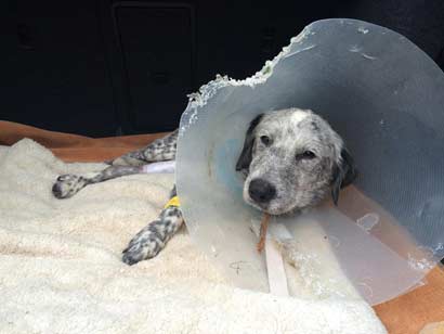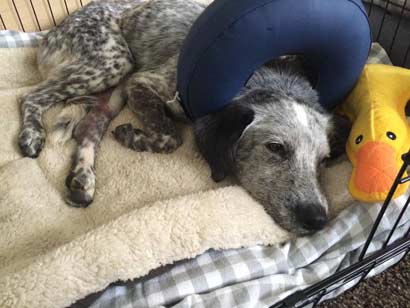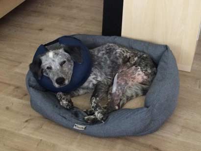 In den ersten Tagen war Elvis´ Beinchen sehr heiß und geschwollen und man hat deutlich gemerkt, dass es ihm nicht so gut geht. Daraufhin wurde die Dosis an Schmerzmittel erhöht. Schon am 2 Tag kam die Physiotherapeutin zur Lymphdrainage, was super gegen die Schwellung geholfen hat. Das machte es dann für Elvis erträglicher und er hat sich mit seinem Schicksal und dem Halskragen besser arrangieren können.