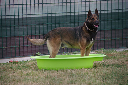 Manchmal darf er den halben Tag in den großen Freilauf liegen wo er dann alles überwachen darf. Dabei fühlt er sich sichtlich wohl.