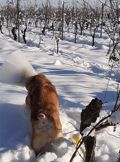 Im Hintergrund wird mit einer elektrischen Rebenschneidmaschine gearbeitet.