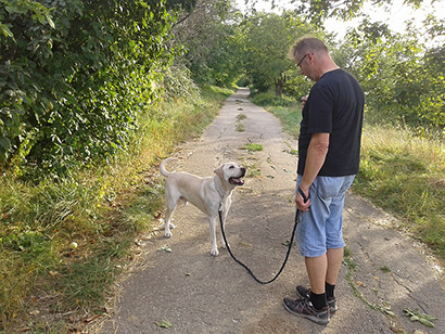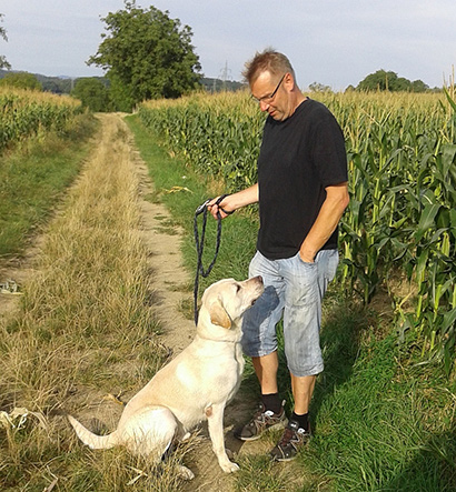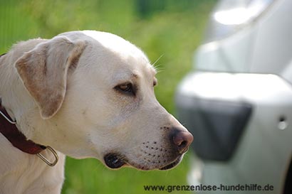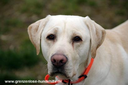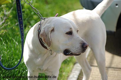 Der blonde große Labrador Rüde Harkos wurde von seinem Besitzer sehr streng erzogen.
