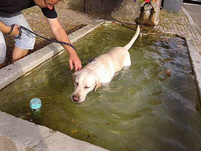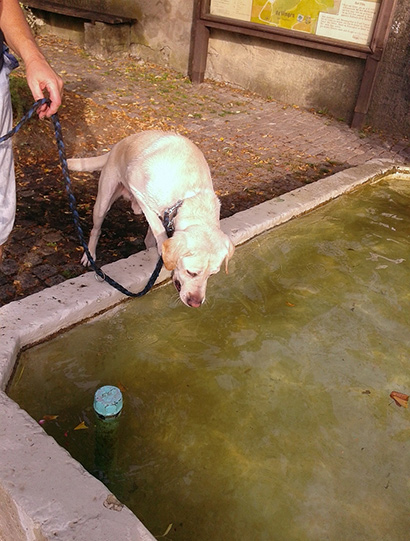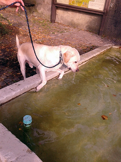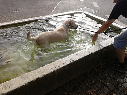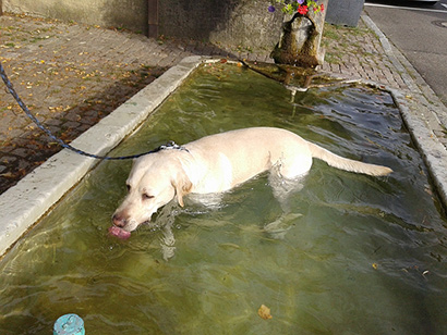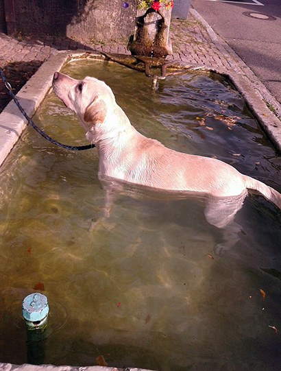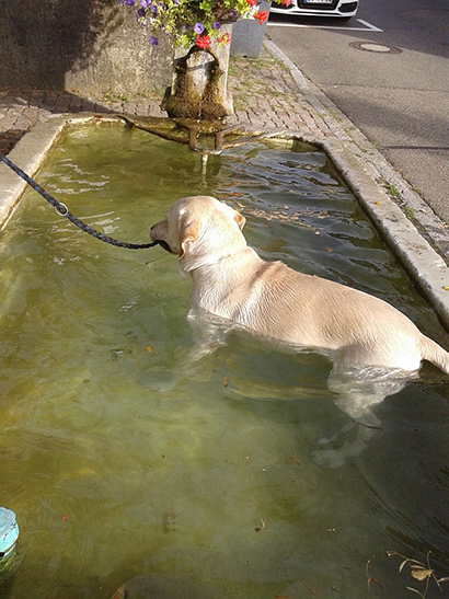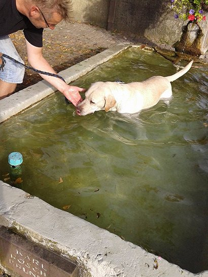 Harkos geniesst es immer sehr Gassi zu gehen und das anschliessende Baden im Dorfbrunnen ist das absolute Highlight für beide ;)