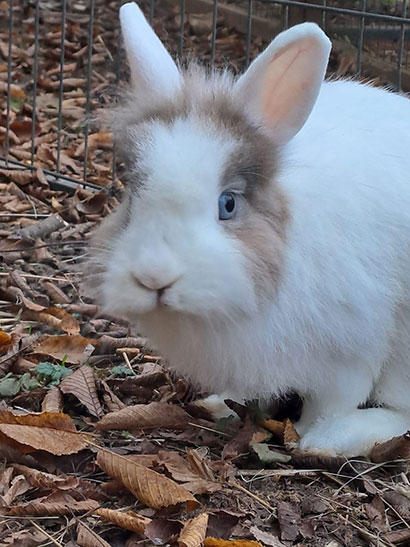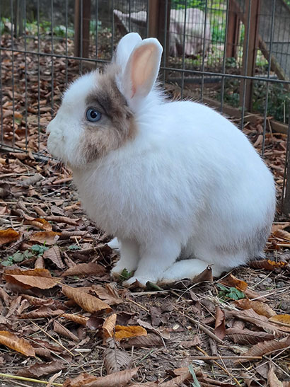 Jodie lebt bei uns im Verband in Aussenhaltung mit anderen Hasen ohne Probleme zusammen und alle haben Zugang zu einem Stall.