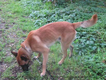 Nach einiger Zeit und mehr Abstand zum Tierheim wurde er jedoch entspannter, ging seinen Weg und schnüffelte am Wegesrand. Sobald man ihn jedoch zu einem Kommando aufforderte, begann er schon wieder nervös zu werden.