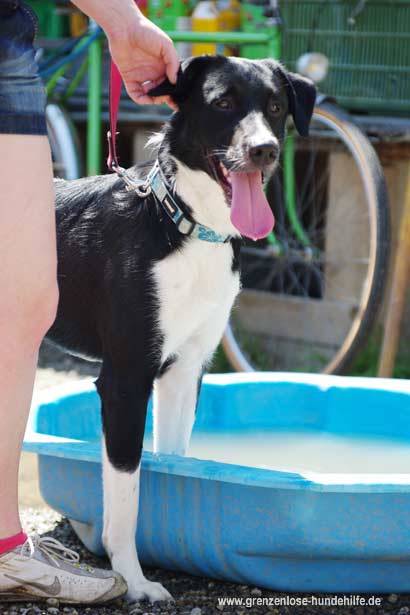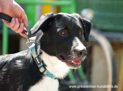Am Ende der Zwingerreihen befindet sich ein wunderschöner, schwarz weisser Border Collie Mix. Sein Name ist Hidalgo.