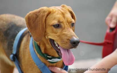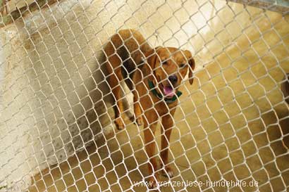 Sie versucht immer ganz verzweifelt, im Zwinger auf sich aufmerksam zu machen. Oh, wie sie sich freut als ich ihren Zwinger betrete, um sie anzuleinen. Vor lauter Glück überschlägt sie sich schier. Alles was sie sieht ist toll: Menschen, da will sie sofort Küsschen geben, andere Hunde: spannend, sie will toben und spielen. Schnüffeln, munter umherspringen, sich streicheln lassen, sich im wunderbar kühlen Gras wälzen.