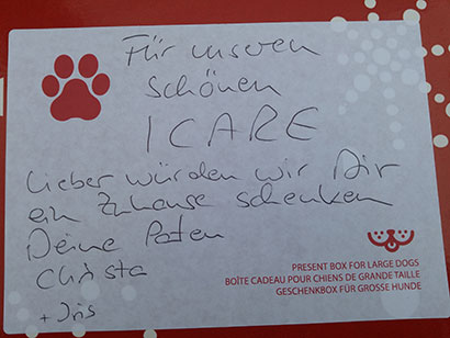Wir wussten nicht wie Icare sich verhalten wird wenn wir mit dem Geschenkpaket in den Freilauf kommen und ihn das Paket mit auspacken lassen.