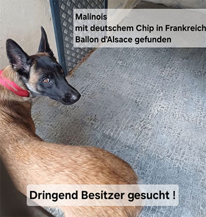 ‼️Achtung – bitte ganz dringend teilen ‼️ Im Elsass wurde eine Malinois Hündin (Belgischer Schäferhund) gefunden. Der Hund trägt einen deutschen Chip – es könnte sich also um den Hund von deutschen Urlaubern handeln! (Der Chip ist weder in Frankreich, noch in Deutschland registriert)