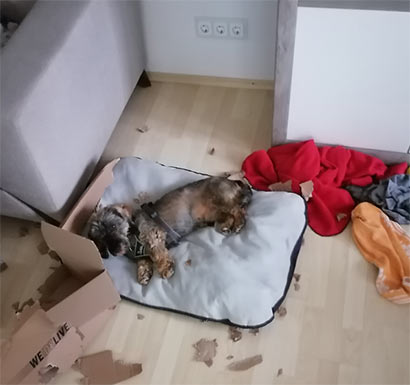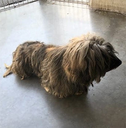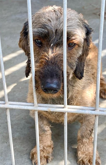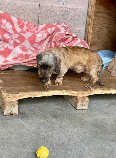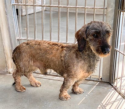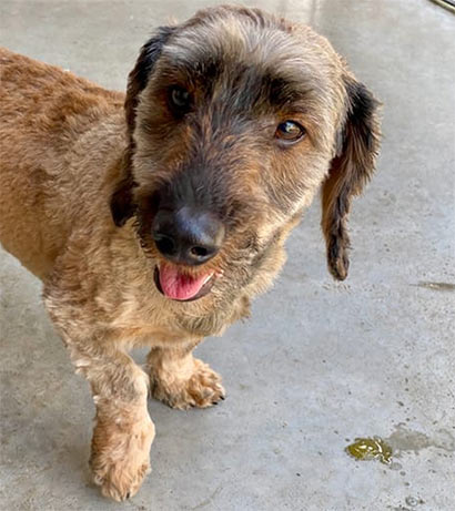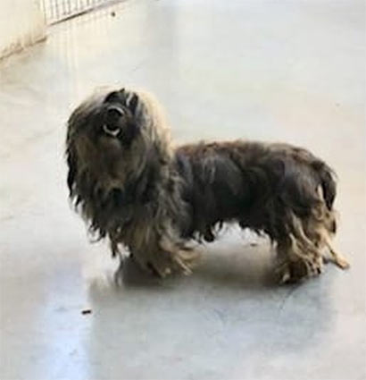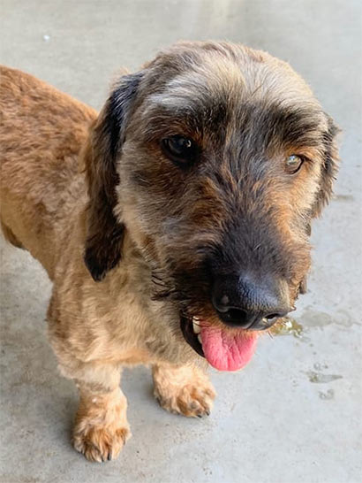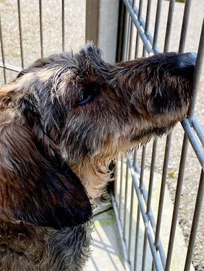 Inouk wurde in diesem Zustand im Wald gefunden und niemals wären wir auf die Idee gekommen, dass sich unter dem verfiltzen, schmutzigen Fell ein Rauhaardackel befindet! Nach dem die Hundefriseurin 2 Stunden brauchte und ihn mehrmals baden musste, trauten wir unseren Augen kaum- zum Vorschein kam ein bildhübscher Hundemann mit vielen alten Wunden an seinem kleinen Körper. Nach ein paar Recherchen, fanden wir heraus, dass Inouk ein sehr trauriges Leben hatte. Er wurde in einer dunklen Halle gehalten und musste dort das Futter der Hoftiere bewachen. Tagein, tagaus, mit wenig Ansprache :((( Seine Geschichte macht uns sehr betroffen. Inouk hat keinen Groll gegen uns Menschen. Im Gegenteil- wir haben einen lieben, ruhigen aber sehr verloren Hundemann kennengelernt, der in seiner jetztigen Situation verzweifelt und traurig ist. Er ist verständlicherweise verstört und wir glauben, dass er auch misshandelt wurde, denn Inouk hat große Angst vor der Hand und in seiner Verzweiflung macht er auch unter sich :((