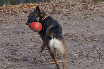 Der Rüde hat einen sehr guten Grundgehorsam und läuft sehr brav an der Leine.
