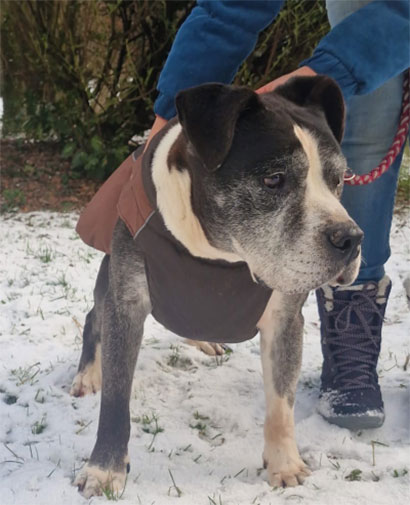 Er benötigt inzwischen spezielle Schuhe für die kleinen gemütlichen Runden, die er mit seiner Gassigängerin macht.