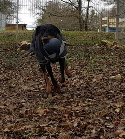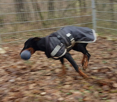 Gut eingepackt in einen Hundemantel geniesst sie mittlerweile das Spielen im Freilauf :)) und das schmusen in der Box.