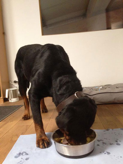 Inzwischen hat er auch zugenommen. Schön ist, dass er sich, wenn ich mit dem vollen Napf komme, hinsetzt und brav wartet bis das Fressen auf dem Boden steht.