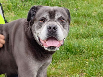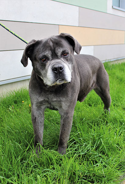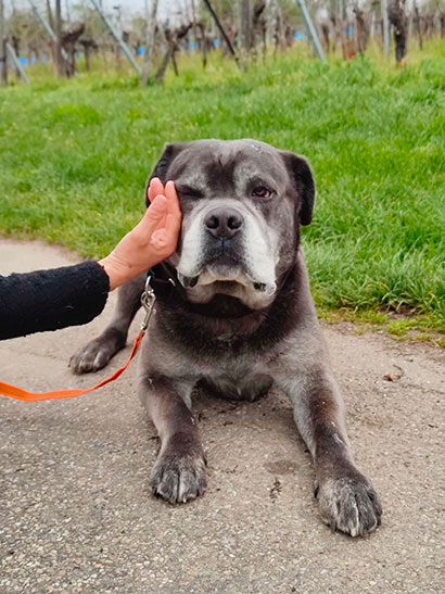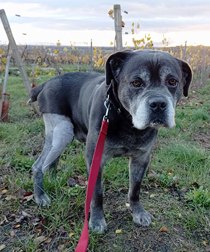 Mit einem Jahr wurde der Rüde an einem Kreuzband operiert. Daher kann es vorkommen, dass er ab und zu etwas humpelt.
