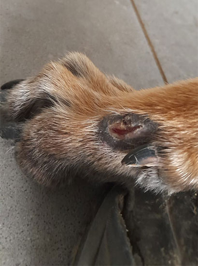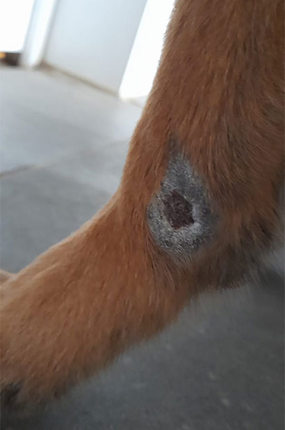 Durch die stetige Leckerei hat sie an Pfoten und Beinen offene Stellen.