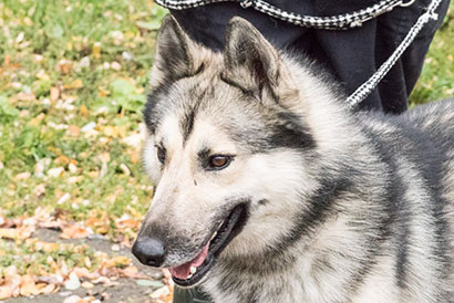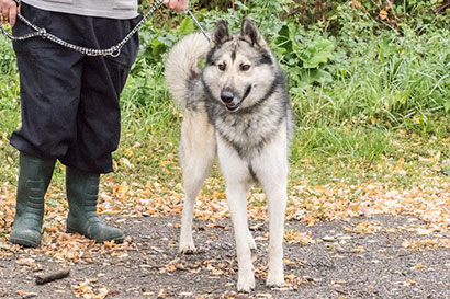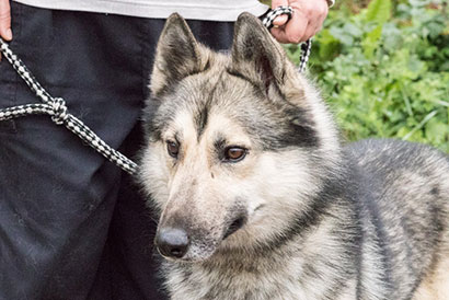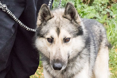 Der schöne Husky-Mix ist ein ganz toller Junge. Wenn man ihn aus seinem Zwinger holt, macht er lustige Freudensprünge.