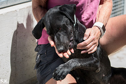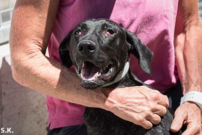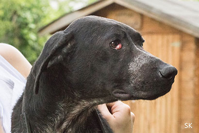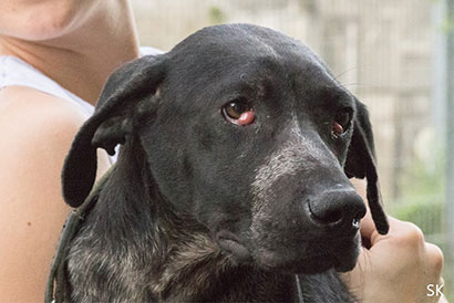 Sie ist ca. 1 Jahr alt und hat einen Nickhautdrüsenvorfall (Cherry Eye). Wir gehen davon aus, dass sie deshalb ausgesetzt wurde.