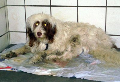 Nun wurde er von seinem schmutzigen und völlig verfilzten Haarkleid befreit und sieht geschoren nicht nur total verändert aus; wir wissen nun auch, warum er anfangs nicht aufgestanden ist: