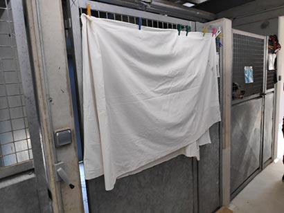 Da Joe dem Stress im Tierheim nach wie vor nicht standhalten kann hat man sich, wie schon zuvor bei Goliath, dazu entschlossen auch bei Joe den offenen Teil des Zwingers mit Tüchern abzuhängen.