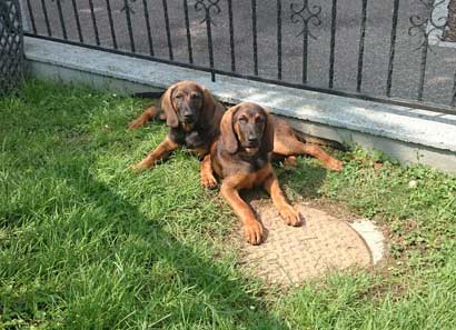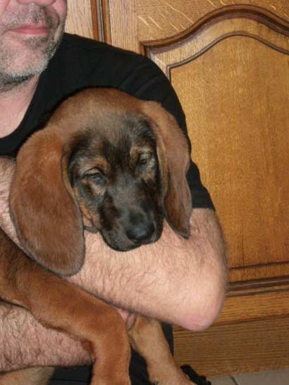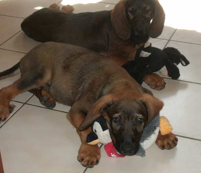Laut beigefügtem Zettel ist Joyce´s Mutter eine reinrassige Rouge de Bavière übersetzt Bayrischer Gebirgsschweißhund. Der Vater sei unbekannt.