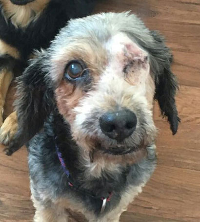 Der Mixrüde ist übersäät mit Wucherungen an Augen und Ohren.
