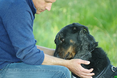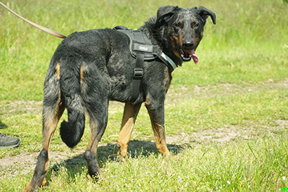 Der schlanke Harlekin Beauceron Rüde Kaid wurde im Tierheim abgegeben weil sein Besitzer gestorben ist und die Witwe einen Umzug in den Süden Frankreichs plant.