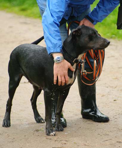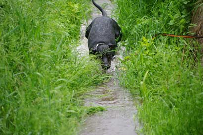 Sportlich wie sie ist, legt Madame ein ordentliches Tempo an den Tag, aber einmal an der Schleppleine ist es angenehm mit ihr zu laufen. Am Tümpel angekommen ist sie kaum zu bremsen, ich lasse sie trotzdem "Sitz" machen, die Vorfreude auf dass Wasser zieht bei ihr besser als jedes Leckerchen ;) Einmal freigegeben nimmt sie Anlauf und springt elegant, mit perfekt durchgestreckten Hinterläufen wie ein Turmspringer ins Wasser. Sie könnte Stunden in diesem Tümpel ihre Runden drehen, Stöcke an Land ziehen, wieder Anlauf nehemen und springen aber irgendwann müssen wir dann doch aufbrechen.