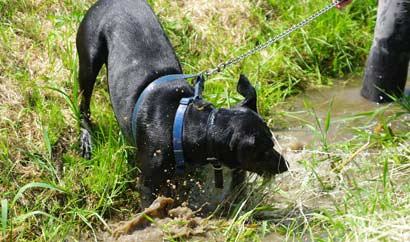 Aus dem Zwinger raus und PLATSCH, zielsicher ins erste Planschbecken welches bei den hohen Sommertemperaturen im Tierheimhof steht. Dort verbringt sie dann erstmal ein Weilchen und planscht mit einer Energie, dass alle im Umkreis von zwei Metern mitbegossen werden. Man kann sagen, sie ist in Ihrem Element! Ich fordere sie zum weitergehen auf, und schwupps liegt sie im nächsten Becken. Nachdem dann jedes Becken von Kali gebührend eingeweiht ist, marschieren wir los.
