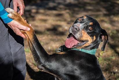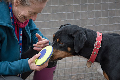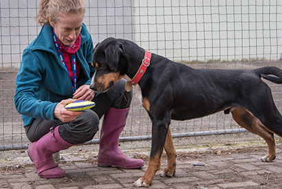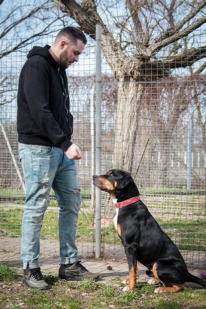 Karabas kennt einige Grundkommandos. Er setzt sich hin und nimmt Leckerlis vorsichtig entgegen.
