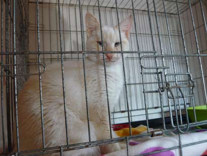 Er ist cremefarben mit einem Hauch rosa und blauen Augen.