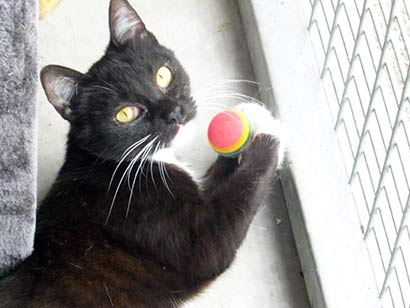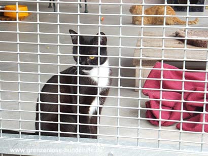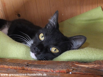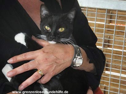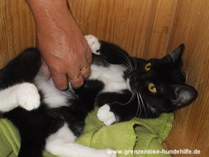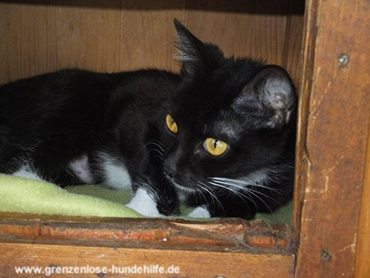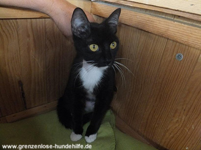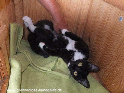 Im Gegensatz zu Stessi ist sie noch etwas zurückhaltend. Geht man aber langsam auf sie zu, ist sie gleich zum schmusen und spielen bereit.