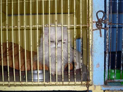 endlich komme ich dazu, Ihnen ein paar Bilder von Bijou zu senden. Er ist ja am Samstag, zwar ein wenig verschnupft, aber sonst gut angekommen. Sein Zimmer hat er sofort rundum besichtigt und sich dann ins Körbchen zu einem Schläfchen zurückzuziehen. Er schläft bei mir sehr viel und sehr tief. Ich gehe jede Stunde mal ins Zimmer um nach ihm zu sehen. Meist merkt er gar nicht, daß ich da bin. Bereits am ersten Abend hat er sich schon streicheln lassen und Köpfchen gegeben. Am Körper läßt er sich so gut wie gar nicht streicheln. Er reagiert sofort aggressiv. Ich denke, ihm machen die vielen Knubbels im Fell weh. Am Sontag habe ich versucht, ihn leicht zu bürsten und zu kämmen. Hat leider nicht geklappt: Die Knubbels sind zu nah an der Haut und mit dem Kamm hat man keine Chance. Diese auseinander- ziehen läßt er nicht zu. Aber fressen kann er wie ein Scheunendrescher und ihm schmeckt anscheinend alles was ich ihm vorsetze. Er hat es aber auch dringend nötig. Die ersten vier Tage ist er jedesmal beim sich schütteln umgefallen. Er ist schon sehr dünn. Auf den Arm nehmen läßt er sich bis jetzt noch nicht. Vielleicht wird es nach dem Scheren besser, doch das ist nicht vor Ende nächster Woche möglich. Er soll sich erst mal richtig erholen und etwas zunehmen. |