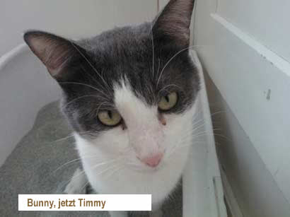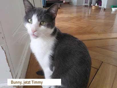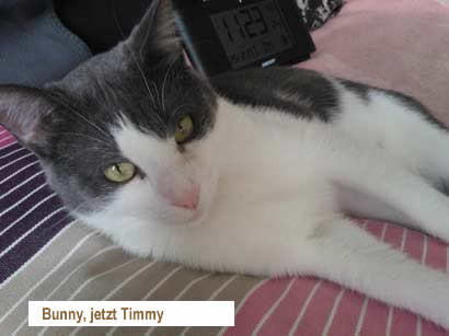 Bunny (jetzt Timmy) ist ein sehr verschmuster lieber Kater, er gibt Köpfchen und fordert seine Streicheleinheiten ein - Bauch kraulen mag er besonders, er liegt gerne auf dem Sofa und teilt am Morgen gerne das Kopfkissen mit mir. Er ist verspielt, putzt sich gerne, kann sich mit Mäusen oder sonstigem Spielzeug selber beschäftigen. Timmy steht gerne im Lavabo und geniesst es wenn ihm das Wasser über den Rücken läuft ;-)
