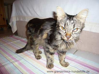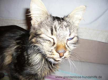 Zunächst hat sie noch selbstständig gefressen, aber leider ist sie jetzt auch noch an schwerem Katzenschnupfen erkrankt und musste sofort stationär in eine Tierklinik.