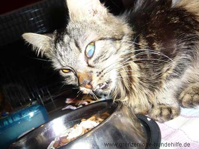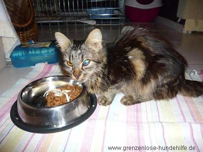 Sie kauert vor dem Fressnapf und versucht es, aber es klappt nicht. Was Ihr genau widerfahren ist wissen wir nicht, da sie verletzt aufgefunden wurde.