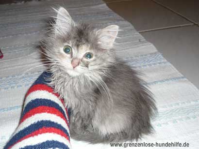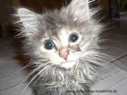 Charlotte ist ein kleiner armer Wurm, angeblich Mitte August geboren, aber optisch auf dem Stand einer 7 wöchigen Katze.